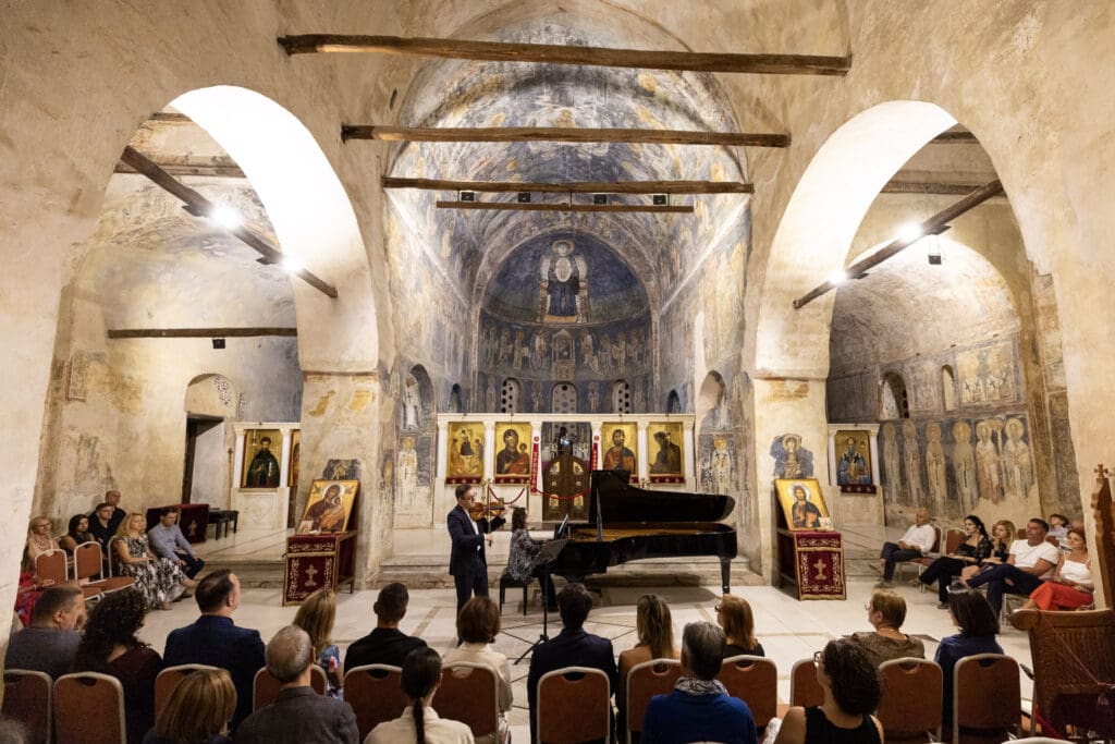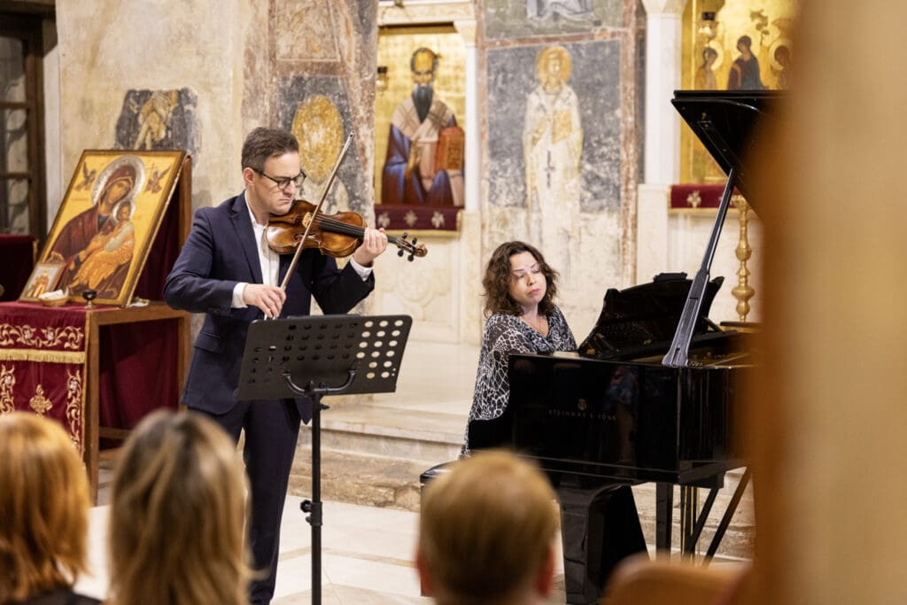 Романтичната вечер која од почетокот ѝ ветуваше  на публиката неповторливо музичко доживување што долго ќе се памети, започна со Соната за виолина и пијано од Франц Шуберт, а продолжи со дела од Шопен, Изаи, Менделсон и Крајслер.